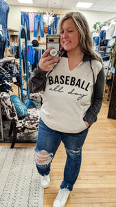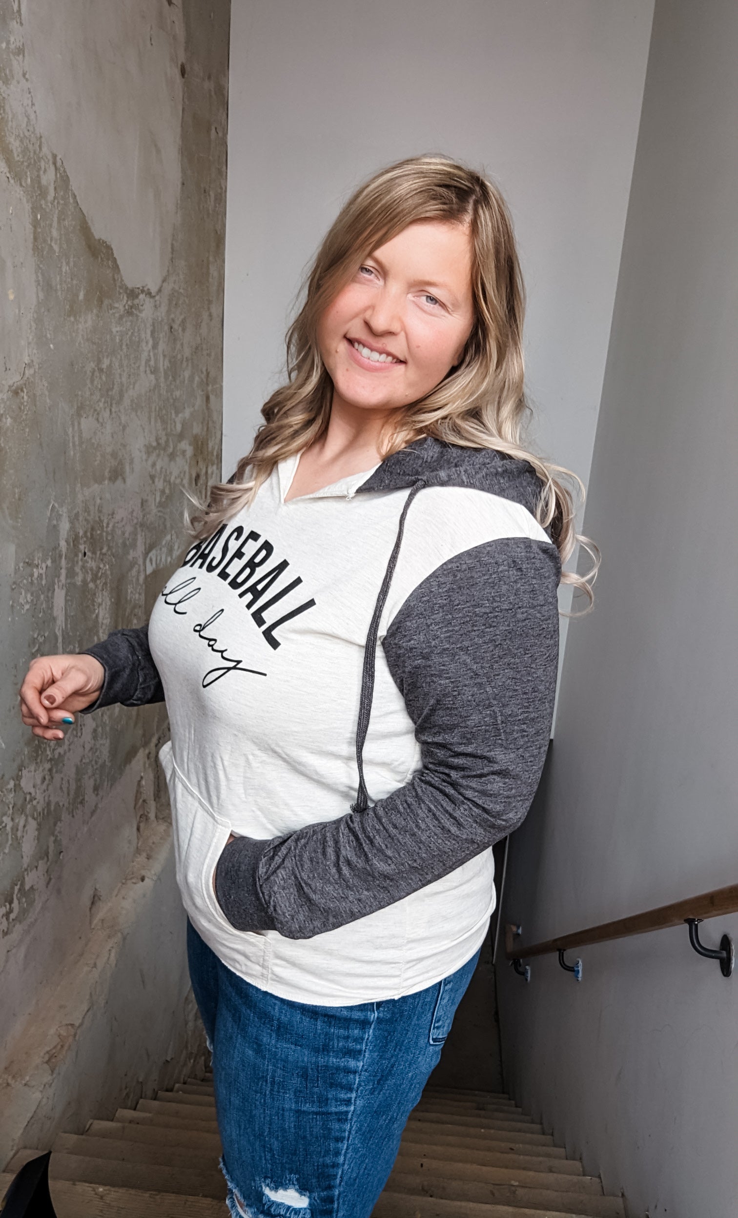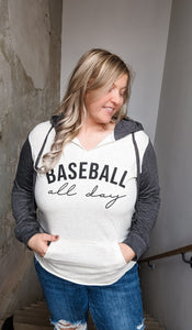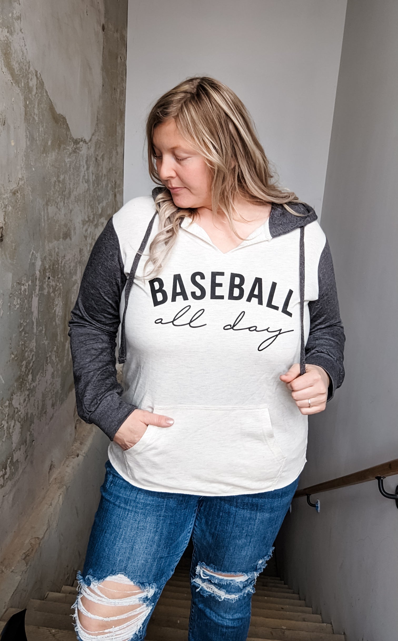This French terry lightweight hooded pullover is perfect for those chilly nights at the ballpark. With the notched neck and contrast hoodie and sleeve this is a sure fire FAVE!