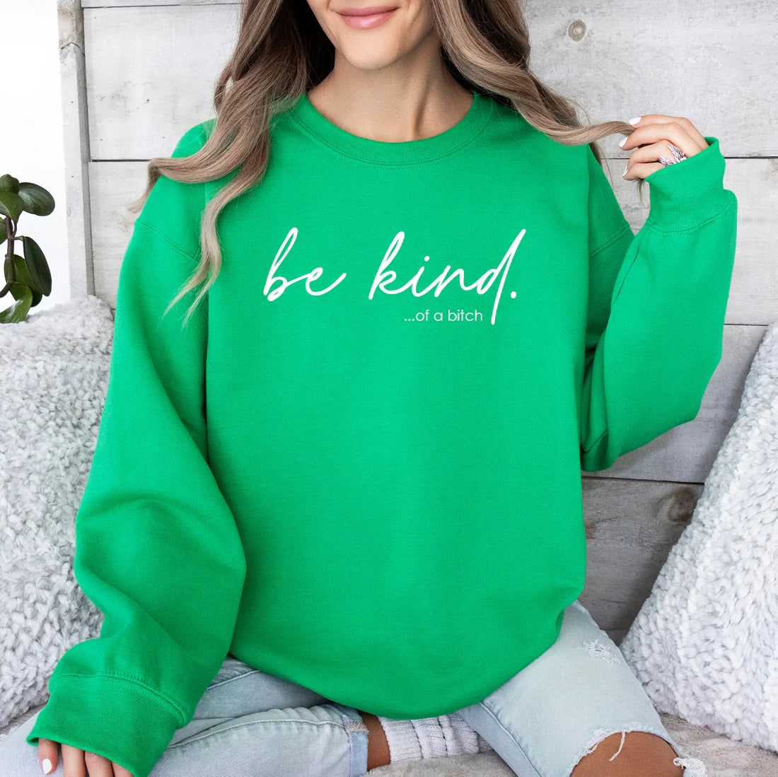 Soft fleece lined crew neck pullover sweatshirt with this ultimate snarky Be kind...of a bi!ch!